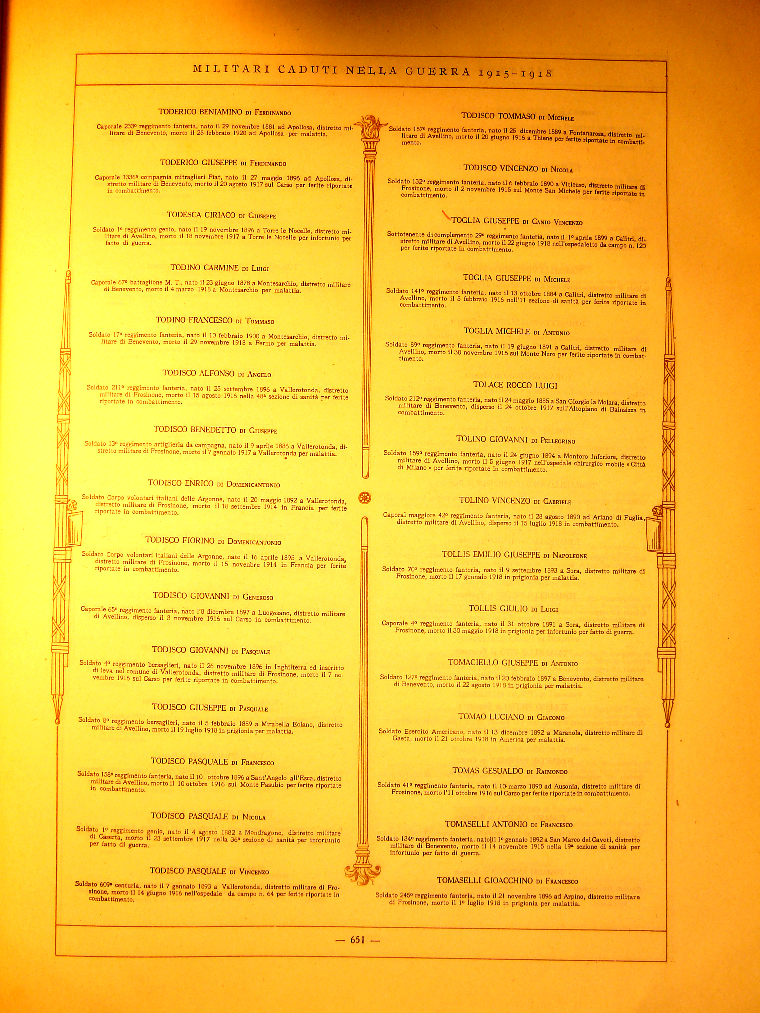 | Toderico Giuseppe | 1896 | Apollosa | Caporale | 1336 Compagnia Mitraglieri Fiat | 1917 | Carso | Ferite riportate in combattimento | Visualizza | |