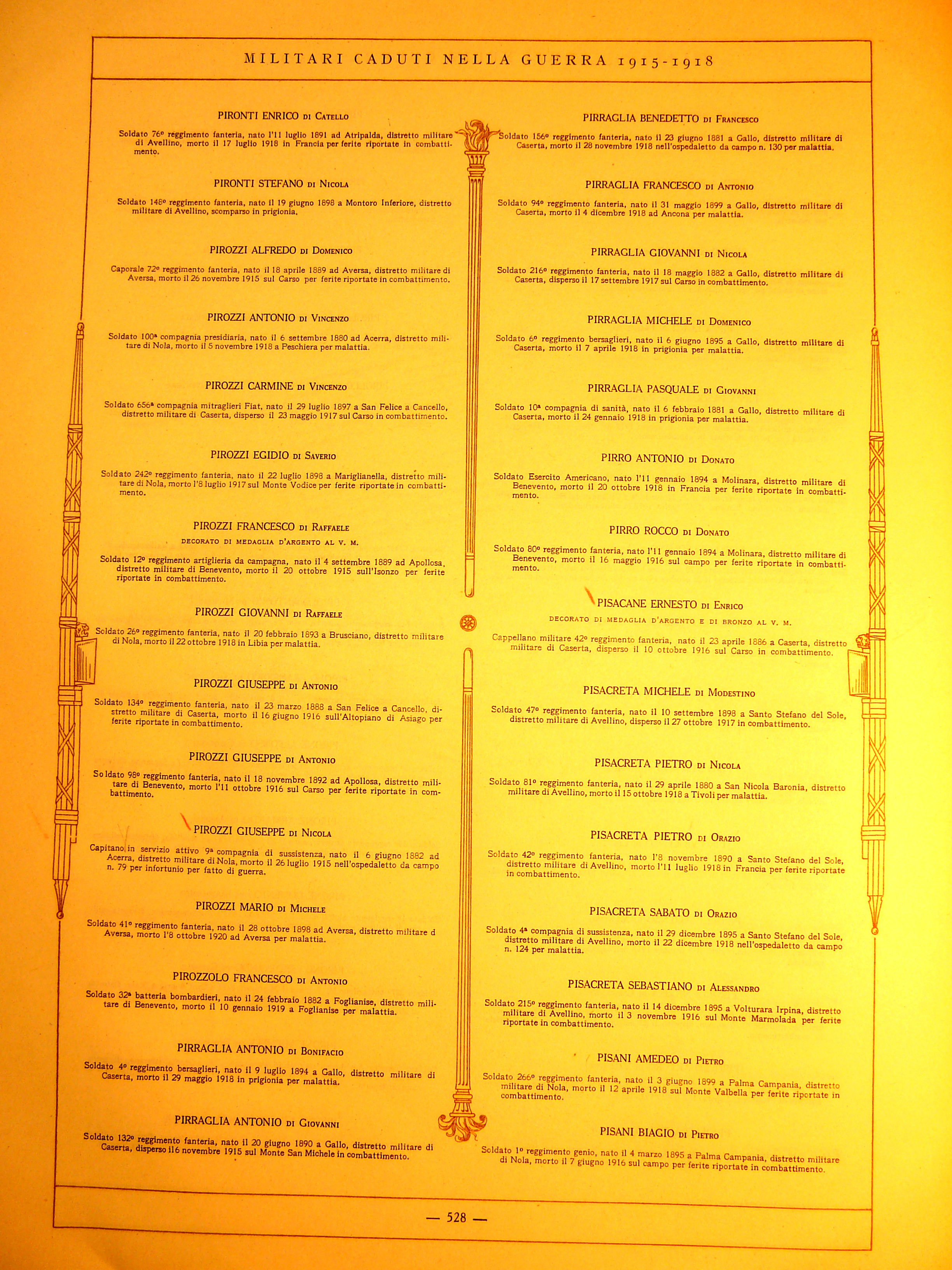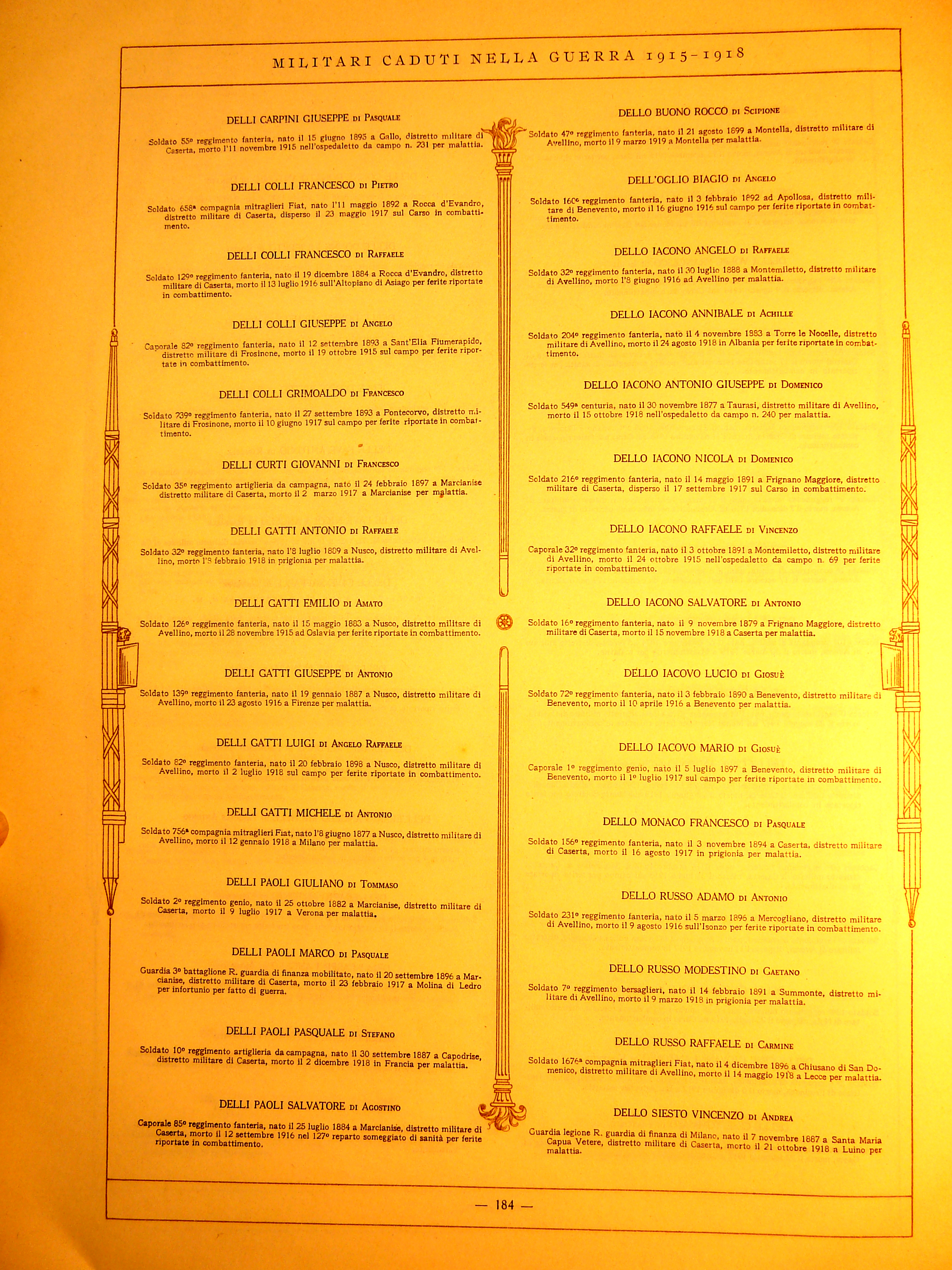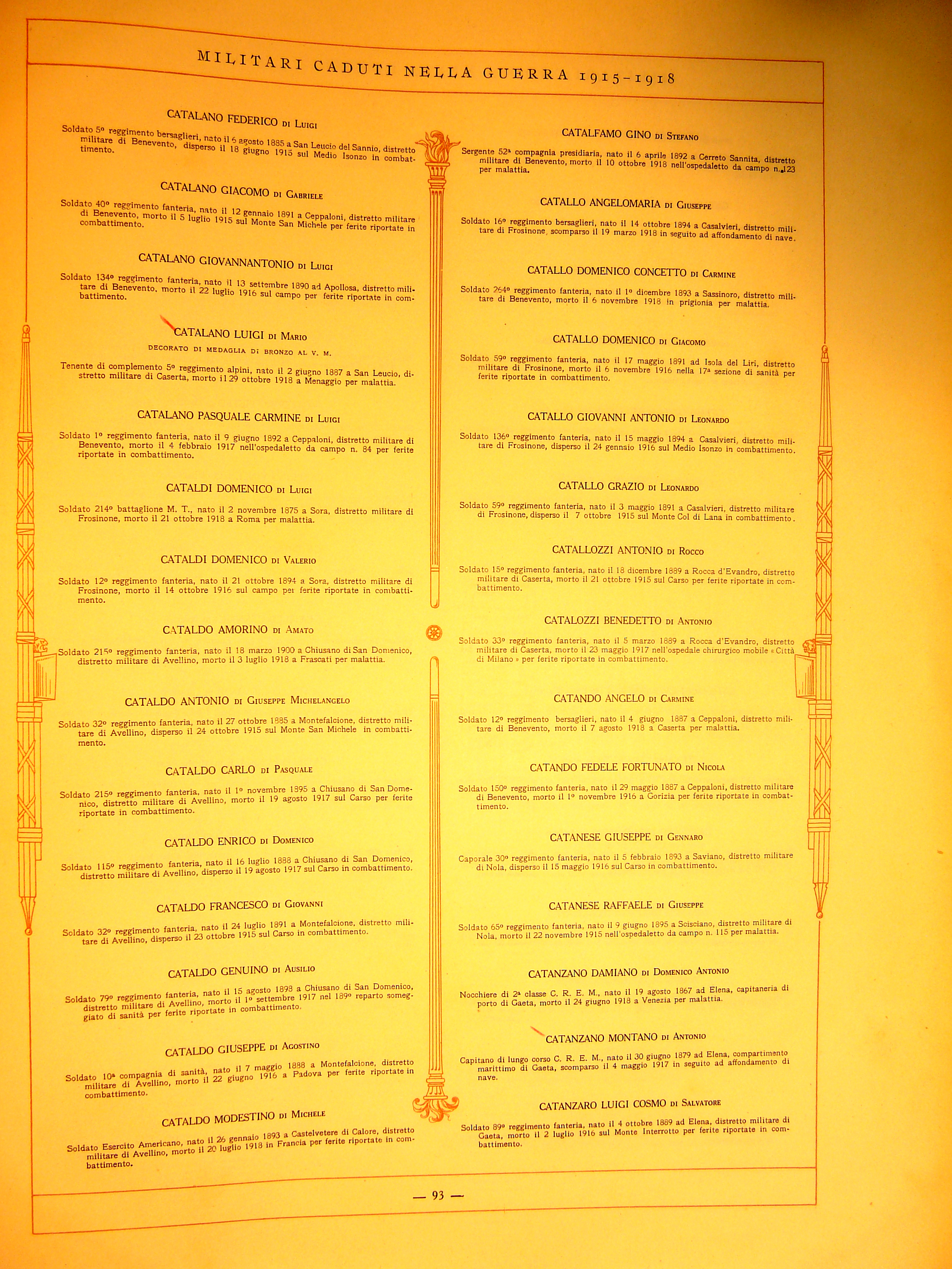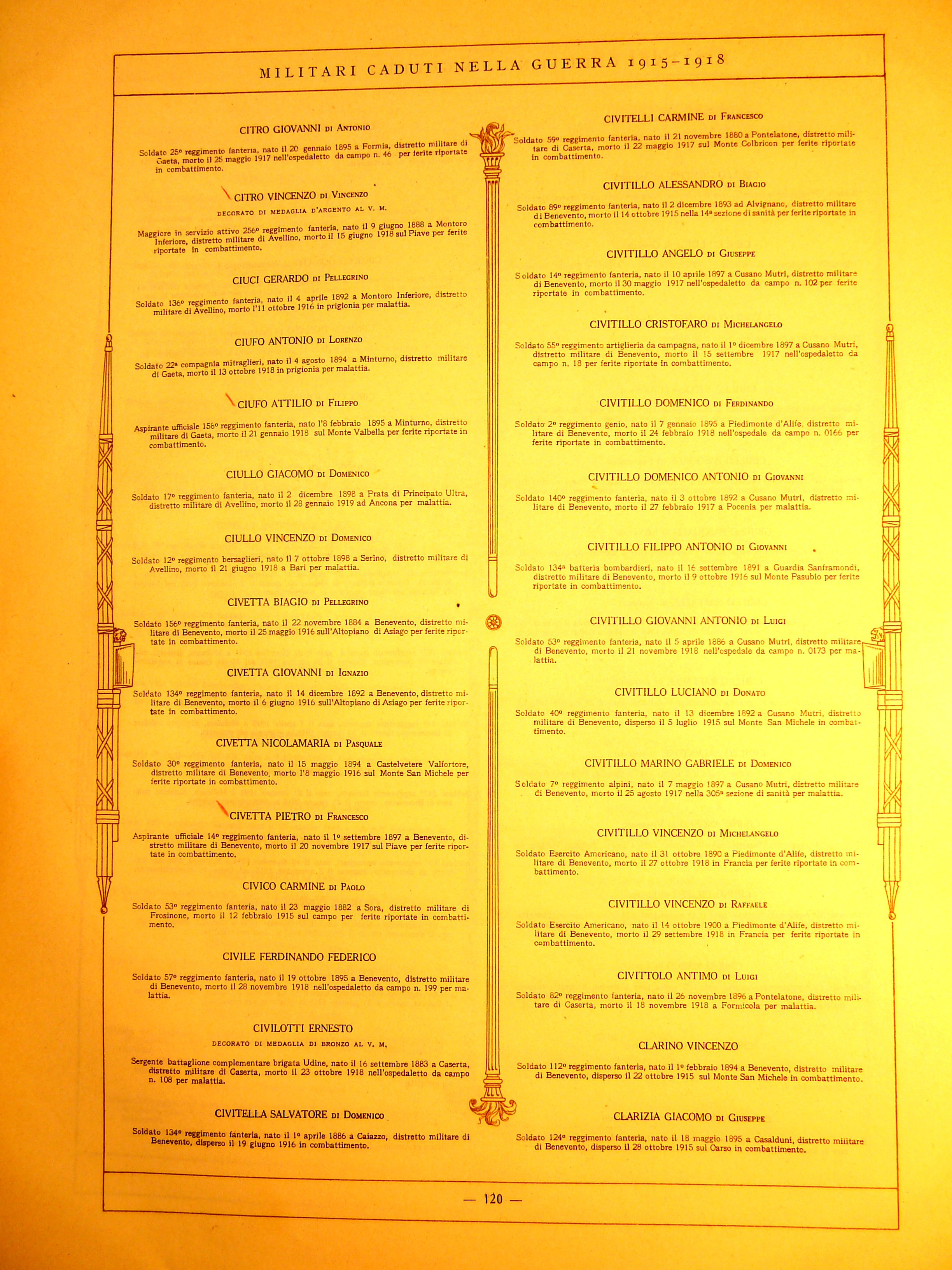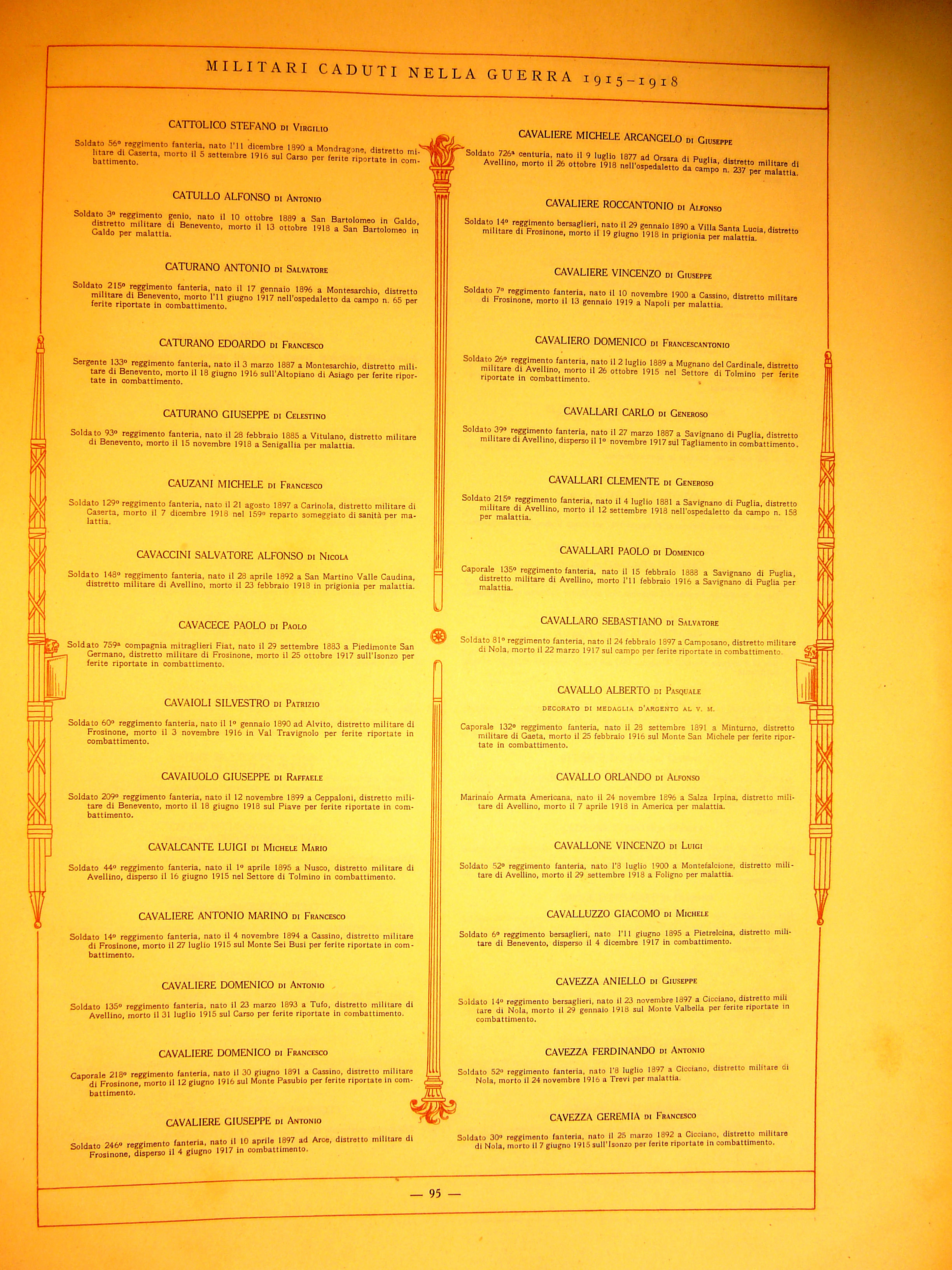 | Cavaiuolo Giuseppe | 1899 | Ceppaloni | Soldato | 210 Reggimento Fanteria | 1918 | Piave | Ferite riportate in combattimento | Visualizza | |