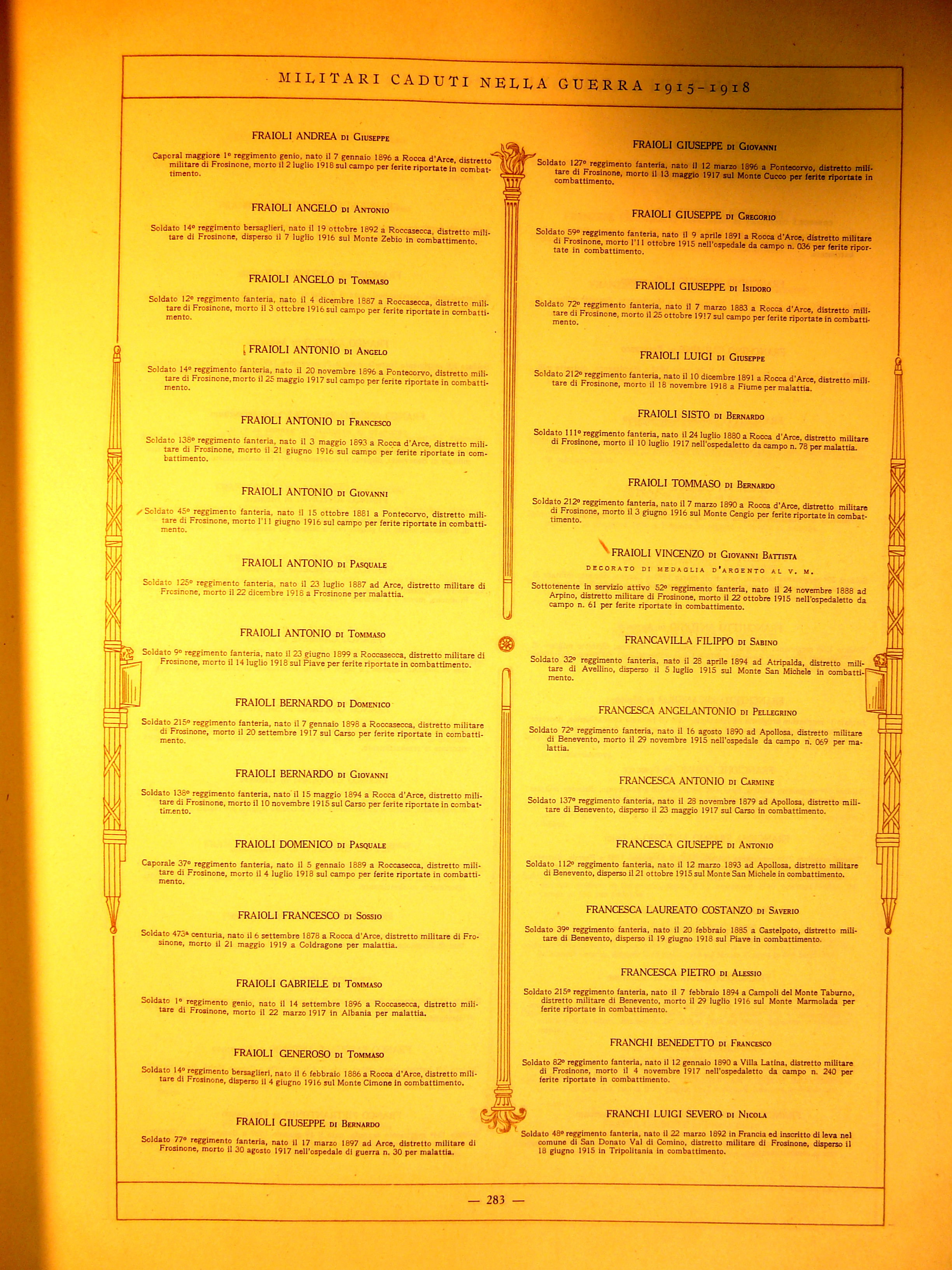 | Francesca Giuseppe di Antonio | 1893 | Apollosa | Soldato | 112 Reggimento Fanteria | 1915 | Monte San Michele | Disperso | Visualizza | |