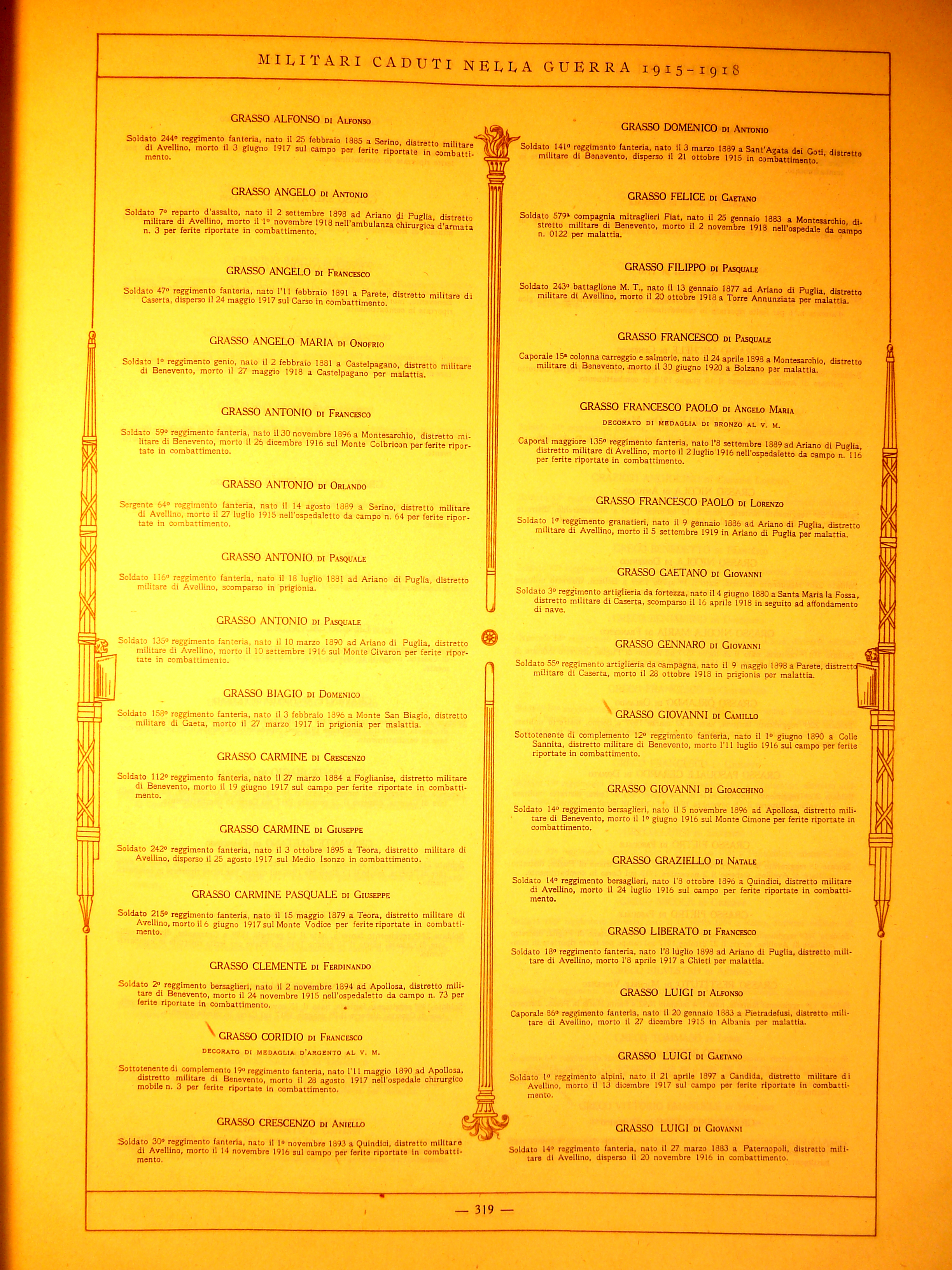 | Grasso Coridio | 1890 | Apollosa | Sottotenente di Complemento | 19 Reggimento Fanteria | 1917 | Ospedale Chirurgico Mobile N. 3 | Ferite Riportate In Combattimento | Visualizza | decorato MAVM |