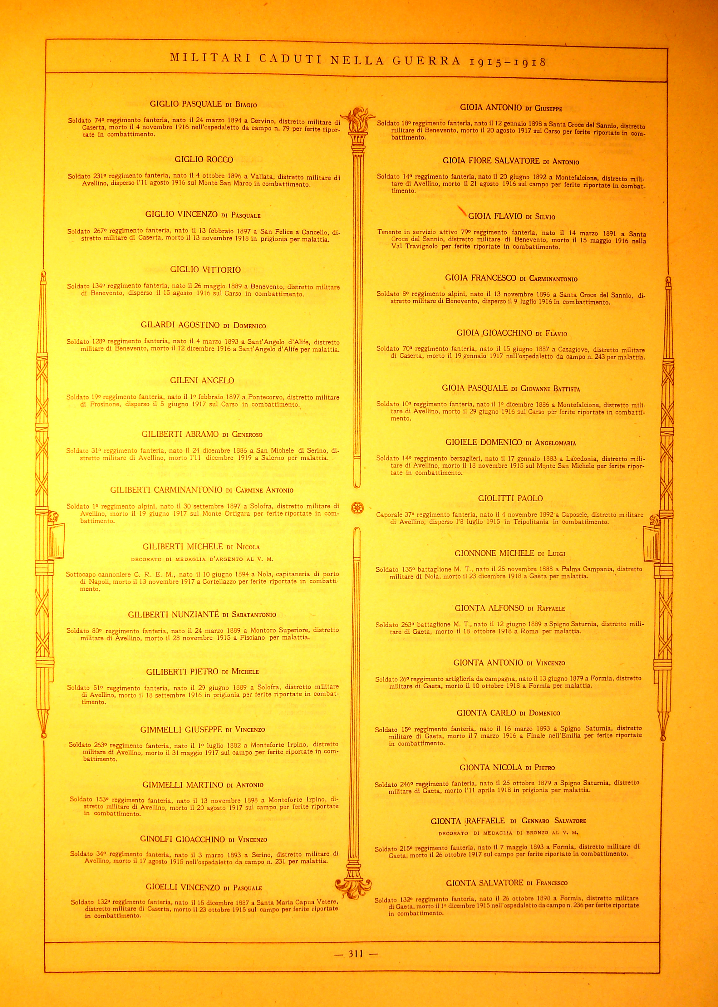 | Giglio Vittorio | 1889 | Apollosa | Soldato | 134 Reggimento Fanteria | 1916 | Carso | Ferite riportate in combattimento | Visualizza | |