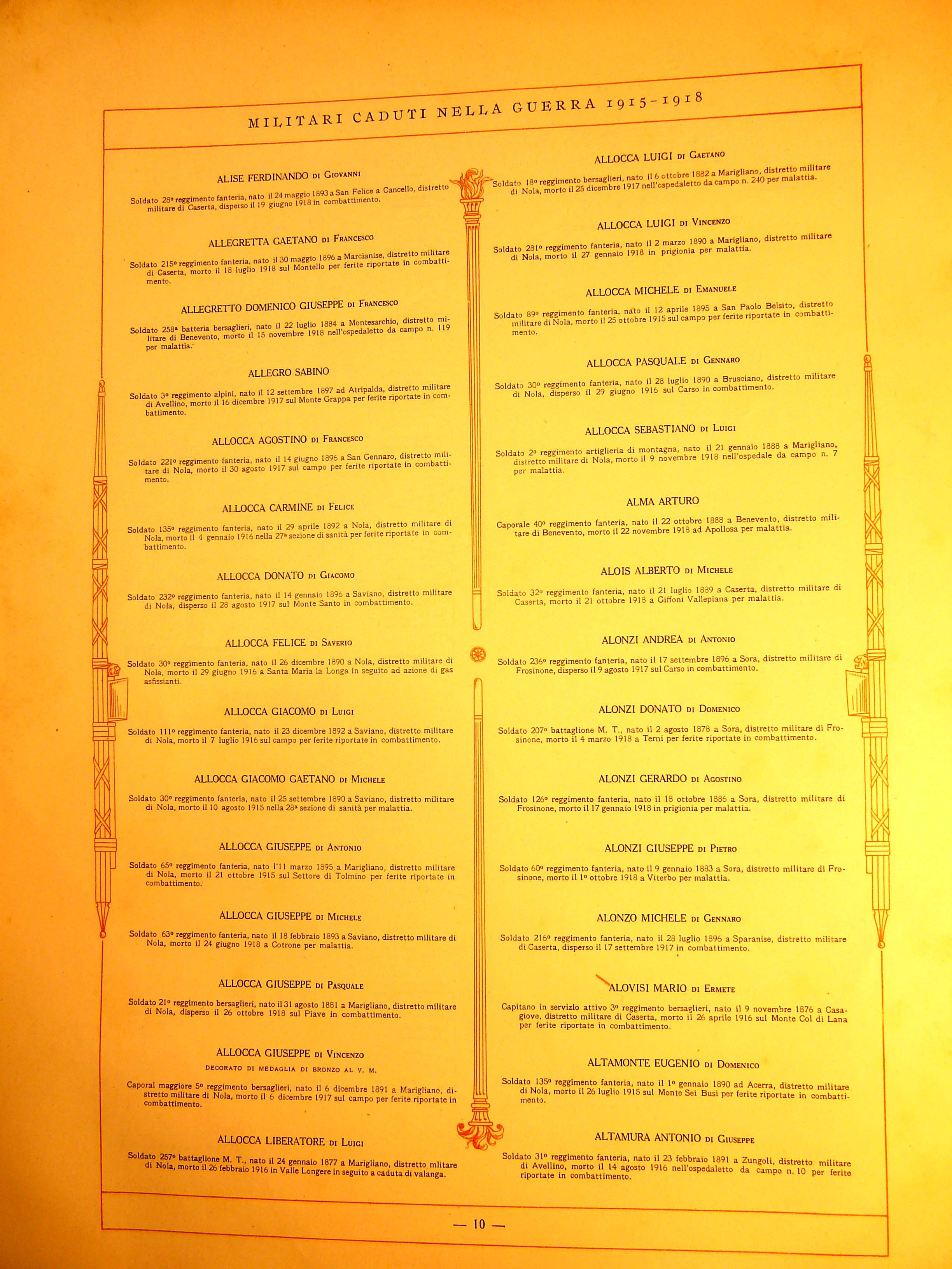 | Varrella Nicola | 1879 | Apollosa | Soldato | 35° Regg.to Artiglieria del Comando del 10° Corpo d’Armata | 1918 | Apollosa | Malattia | ||