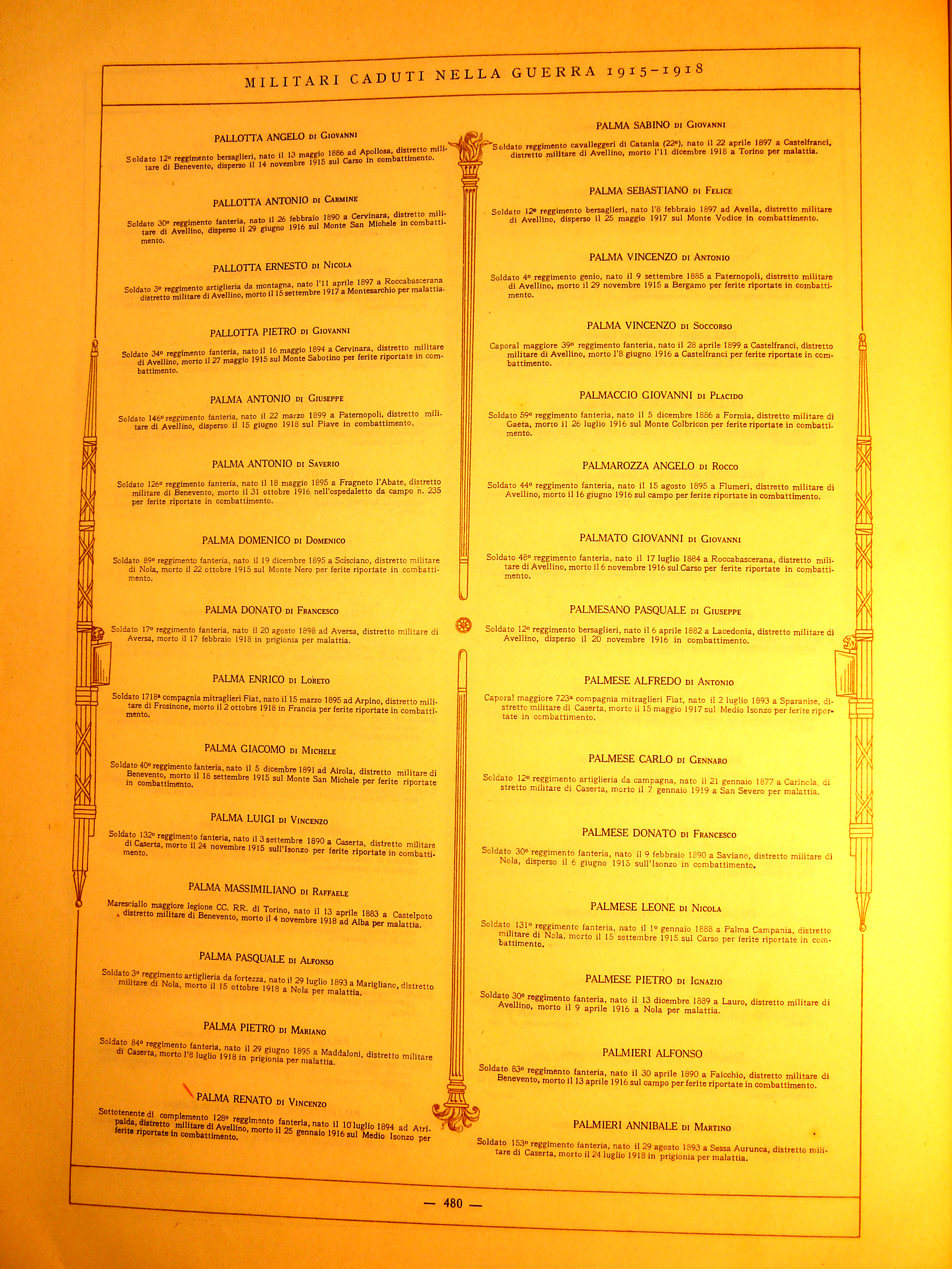 | Pallotta Angelo | 1886 | Apollosa | Soldato | 12 Reggimento Bersaglieri | 1915 | Carso | Ferite riportate in combattimento | Visualizza | |